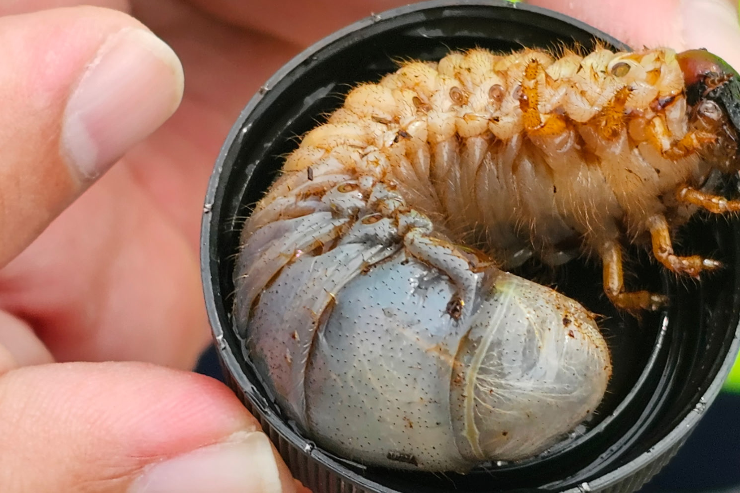 Adult beetles are black, horned and about 2 inches in length. Larvae crawl on their side and curl into a “C” shape when handled.