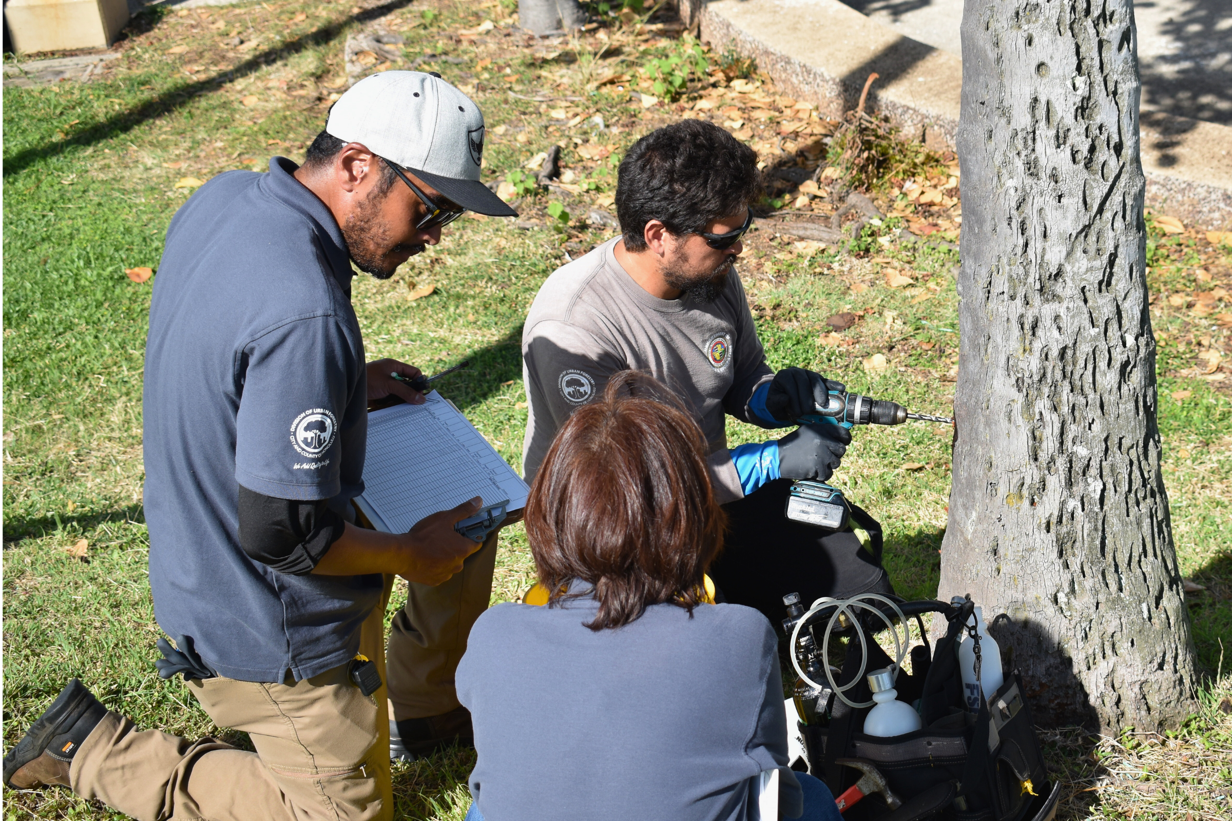 Left: A young tree wrapped in netting. Right: Honolulu Department of Parks & Recreation staff treat palm trees at Kaka‘ako Waterfront Park with an injected insecticide called Xytect. The hope is that the insecticide will prevent CRB from infesting the palm trees. | Noelle Fujii-Oride, Overstory