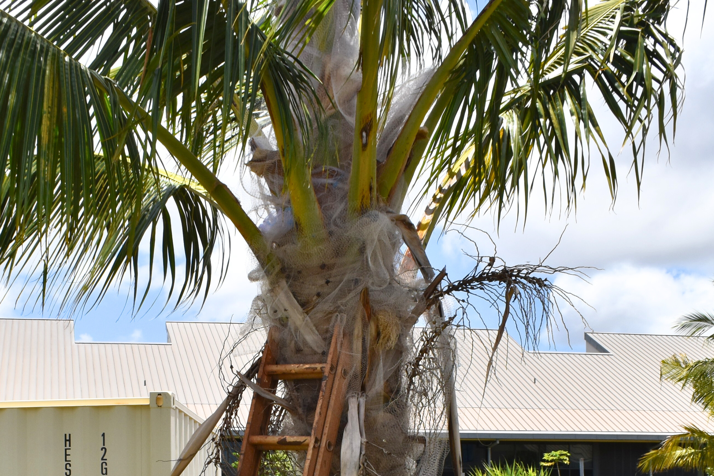 The organization has an additional handout on how to net your tree. Net holes should be ½-1” and be placed at the base of fronds in the upper crown and near the spear. Wrap multiple times and don’t stretch it too tight.